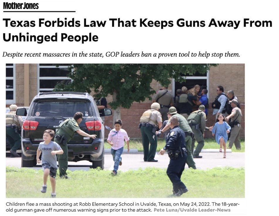 “In late June, Republican Gov. Greg Abbott signed into law the Anti-Red Flag Act, which preemptively bans the creation or enforcement of extreme risk protective orders. Such orders are legal tools used to temporarily prohibit a person from having access to guns after a judge evaluates evidence of alarming behavior and deems that person to be a danger to themselves or others.”
